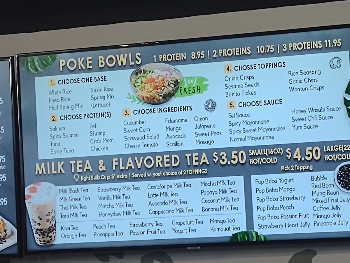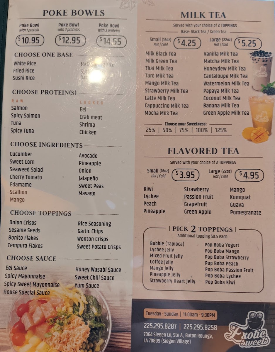 The menu at Exotic Sweets offers an exciting variety of dishes that cater to different tastes and preferences. For a refreshing start, guests can enjoy a selection of flavored teas, including Lychee Flavored Tea and Mango Flavored Tea, with prices available upon request. For heartier options, the fried rice section features choices like Chicken Fried Rice and House Special Fried Rice, while Steak Fried Rice and Shrimp Fried Rice provide flavorful alternatives. Sushi lovers can indulge in party rolls like Ocean Garden (64) and Emperor (82), or explore individual rolls such as the Crunchy Crabmeat Roll and Exotic Sweets Roll. For those craving comfort food, the noodle soups range from Wonton Noodle Soup to Chinese Black Chicken Soup, offering rich, satisfying flavors. Bento box fans will appreciate the varied options, including Shrimp Bento Box and Salmon Bento Box, perfect for a well-rounded meal. If you're in the mood for something sweet, the milk tea options like Taro Milk Tea and Cappuccino Milk Tea provide a delicious, creamy treat. For those looking to enjoy grilled dishes, the Hibachi Combos like Chicken & Shrimp Hibachi and Steak & Salmon Hibachi are great choices. The special combo section includes favorites like General Tso's Chicken and Sweet & Sour Chicken, while the poke bowls offer a fresh and customizable option with 1, 2, or 3 proteins. In addition, the restaurant serves fried noodles and sushi combos that pair perfectly with a refreshing drink such as Pink Lemonade or Sweet Iced Tea. Lastly, the kids' meals provide options like Shrimp Kids Meal and Chicken Kids Meal, ensuring there's something for everyone in the family.
